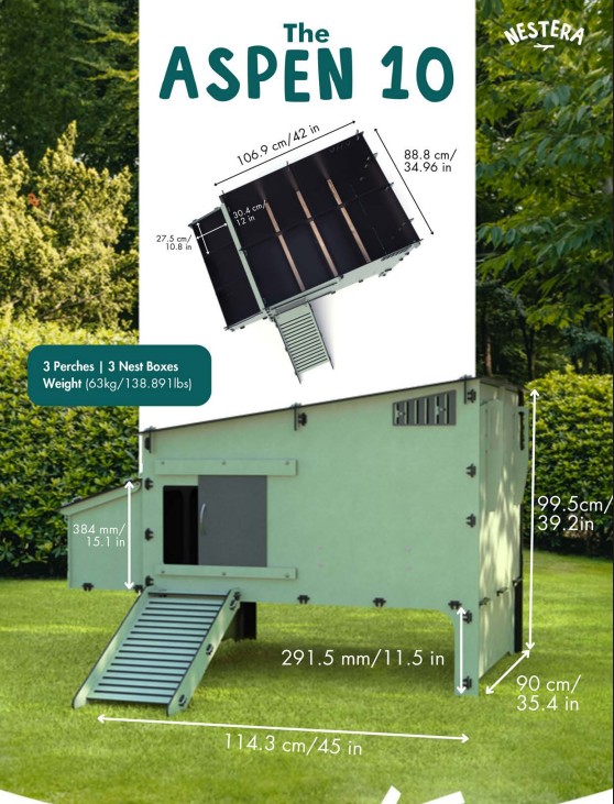 Ce poulailler convient pour un maximum de 10 poules de taille moyenne. Il dispose de 3 perchoirs et de 3 pondoirs. Le poulailler est fabriqué en plastique recyclé de 8 mm d'épaisseur et durera de nombreuses années. Les toits ont une épaisseur de 6 mm. L'espace sous le poulailler mesure 27 cm de haut. Il est également résistant aux intempéries et aux UV, possède une ventilation réglable et est facile à monter. Le poulailler se nettoie facilement et en profondeur à l'eau, ce qui le rend très résistant aux poux rouges, notamment grâce à son intérieur lisse et sans joint. De plus, vous bénéficiez d'une garantie de 10 ans sur ce poulailler. Il est livré en kit. Le montage est à effectuer par vos soins.