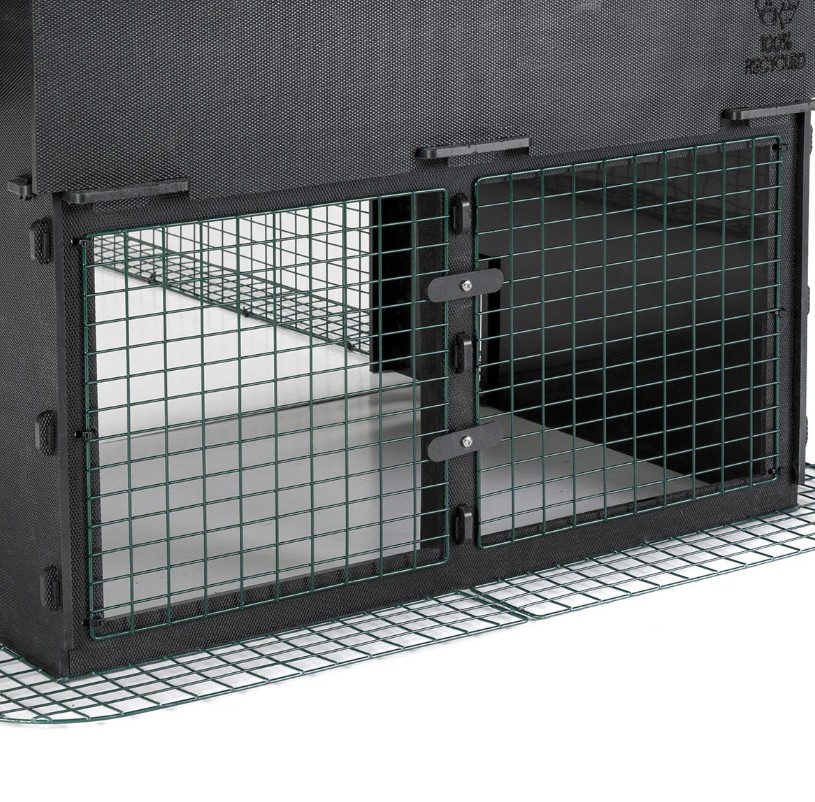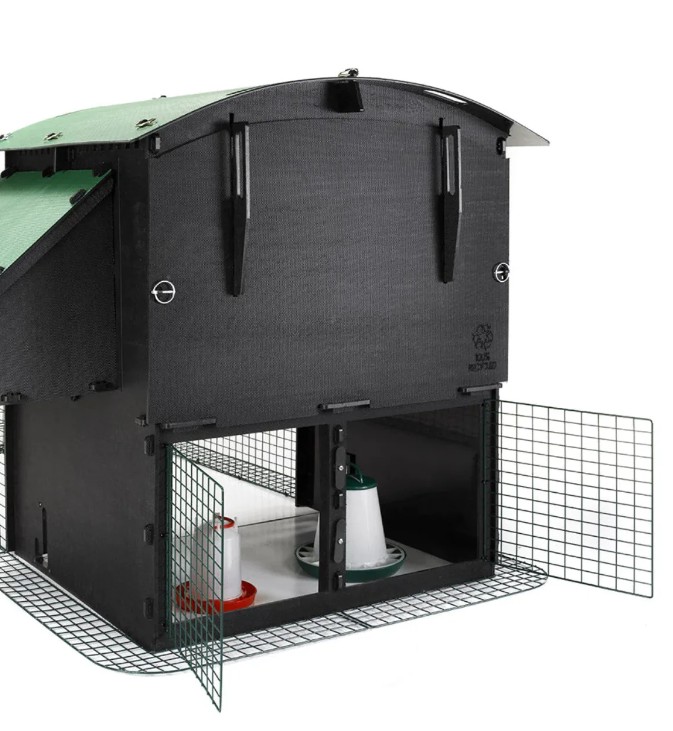Zo wordt de grote afsluitbare deur in het stalen gaas op het eindpaneel gecombineerd met luiken links én rechts onder de achterkant van de Nestera Penthouse kippenhokken. Deze luiken kunnen bovendien veilig worden vergrendeld met behulp van het - uit stevig gerecycleerd plastic vervaardigde - handvat.